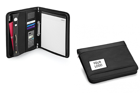 Practical and modern design, various compartments for accessories, mechanism with rings, A4 notepad and calculator included.